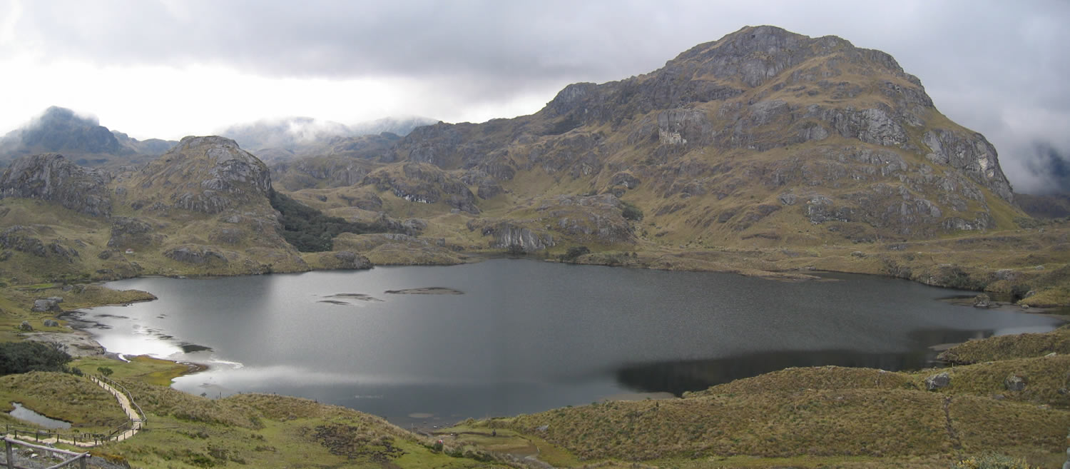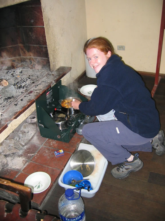 Rio Verde Gorge and Road Next stop was Ingarpirca, the most important Inca ruins in Ecuador and at an altitude of about 3,160m. We were hoping to camp there for the night but it didn't look very sheltered and was too near the village to be completely secure, so we spent a fairly expensive night at the Posada Ingapirca, 500m above the ruins along a steep narrow track. It was a very cold night - no heating but luckily lots of blankets. Up early the next day, we wandered down to the ruins as the sun was rising and were the only ones there. The central structure is a platform believed to have been a solar observatory and there are various stone walls outlining what would have been storehouses etc. It is an interesting site, although not as extensive as some of the Peruvian ruins we have seen in the past. Entry to the ruins is $6 each. After breakfast at the Posada, we then headed to the colonial city of Cuenca, about 2 hours drive away, and enjoyed the beautiful sunny, hot day. A good day for camping, so we headed out to the Parque Nacional Cajas, about 30km southwest of the town, to camp in the hills. The park is known for its plethora of lakes (230 lakes in the 29,000 hectare park) against a backdrop of harsh and bleak countryside. At an altitude of about 3800 - 4500m it was also known for being very cold at night. It took about 45 minutes to get to the Park Entrance from Cuenca and after paying the exhorbitant $10 entrance fee each (locals only pay 50 cents), we headed to the designated camping area at Lake Toreadora on the north side of Cajas. The Park Ranger was just about to go home, but not before informing us that it was another $4 each to camp with no facilities! It was too late to turn back as we only had an hour before dark and even though the Ranger suggested we could stay in one of the two Cabañas around the lake for the same price as staying in our tent, on closer inspection of the Cabañas we decided against it. Lake Toreadora and the inside of one of the "Cabañas" We ended up accepting the kind offer of the Security Guard to kip down in the Ranger Station instead. That meant we could cook under shelter and be up early in the morning without having to pack away the tent. It turned out to be a very cold and none too comfy night sleeping on the floor, and we were woken up around 6am by loud persitant banging on the window. It turned out to be a bird who kept flying at the window, but we took advantage of the early wake-up call and walked around the lake for a couple of hours, enjoying the fresh air and the interesting vegetation. Beef Stew! Then we headed back into Cuenca to catch up on emails and have lunch before heading off to nearby Baños - a smaller version of the one near Riobamba - to camp near the thermal baths - or so we thought. Footprint's South American Handbook was bang up to date (2003) and said that camping was permitted near the thermal springs of Hosteria Durán in Baños. On arriving at the Hosteria Durán, however, the hotel manager informed us that it was no longer possible to camp as there had been problems with security in the past and it was $48 plus taxes to stay the night in the hotel, well over our budget. The manager seemed to take pity on us and offerred us the special corporate rate of $30.50 including taxes for a room for the night with use of the thermal pool and baths. A good opportunity for a restful soak in the therapeutic waters. We ended up staying a second night as the water pump seemed to be making a loud squeaking noise and we thought we might have to change it. After a bit of investigation it turned out to be a "dry" auxiliary belt due to the dusty conditions on the Quilotoa Circuit and the noise quickly disappeared after an application of some wax.