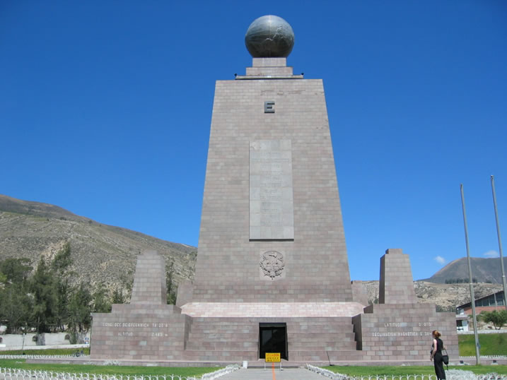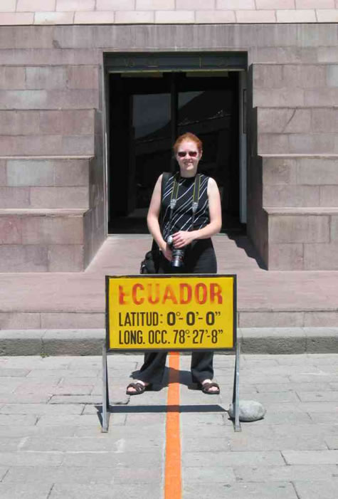 September 8th 2003 Finally we manage to take an excursion outside of Quito. To give the shipping agent a chance to contact us, we decided to catch a local bus and travel to the Mitad del Mundo, the middle of the world, at the Equator. There appears to be no system in getting on and off buses - more like a free for all. Being a Monday morning the roads were absolute chaos and we wandered along the Avenue Americas looking at the signs in every bus we saw to find the one we wanted. Lucky for us that the traffic was all jammed; we saw the bus we needed, jumped out in the traffic and barely had time to get our seats before the bus took off. It took us about 30 minutes just to get out of Quito and it was an experience to say the least, buses cutting everyone up, no lane discipline whatsoever and then it was like being in whacky races once we reached the edge of Quito. All the buses went hell for leather trying to overtake each other, we guessed in an effort to be the first to arrive at the next bus stop and get all the people waiting.. We arrived at the Mitad del Mundo, just outside the village of San Antonio, after about 45 minutes. We took advantage of being early and wandered around before the crowds arrived. They have created a little white city around the monument and it is very much a tourist trap - lots of restaurants and souvenir type shops. The monument itself is 30m high and marks the spot which, in 1736, Charles-Marie de La Condamine and his expedition team determined as the exact location of the equator. You can take a lift up inside to a viewing platform at the top. On a clear day you can make out the volcano of Cotopaxi, but it was a little misty when we were there, so we didn't get to see it. Heading back down the monument there are various exhibitions on the numerous cultural groups to be found all over Ecuador. There are various other museums tracing the history of the search for the equator and so forth, but the most interesting was the Solar Museum where the curator took time explaining to us that the monument we see today is actually in the wrong place; the true equator lies 300m away. An archeological site on top of Catequilla hill sits on the true equator. This site has a curved stone wall, one end of which sits exactly on the equator. If you sit at the end of the wall and look towards the other end, you will be looking exactly where the sun will set or rise during the solstices. (An angle of 23.5 degrees from the equator). Tuesday 9th September We have just found out that the landy will not arrive until Saturday 13th. We are hoping it will get unloaded over the weekend, the customs paperwork will get raised on Monday and we will open the container on Tuesday ready for the customs inspection. Fingers crossed, with any luck and a following wind, we might, just might, get it on Tuesday afternoon. Can't wait for the Landy to arrive now. We have been hanging around in Quito long enough now and the worst bit is not being able to go too far as we have been waiting for the shipping agent to contact us at the hotel. Out for a fish dinner with the rest of the Spanish Students. |