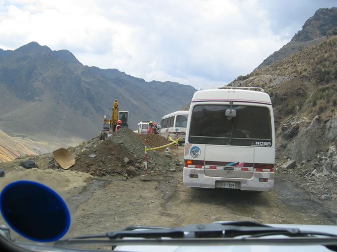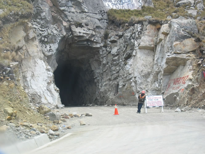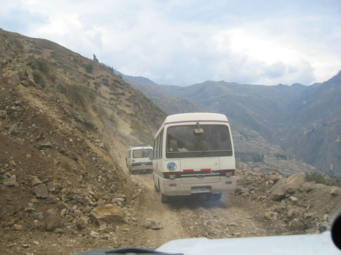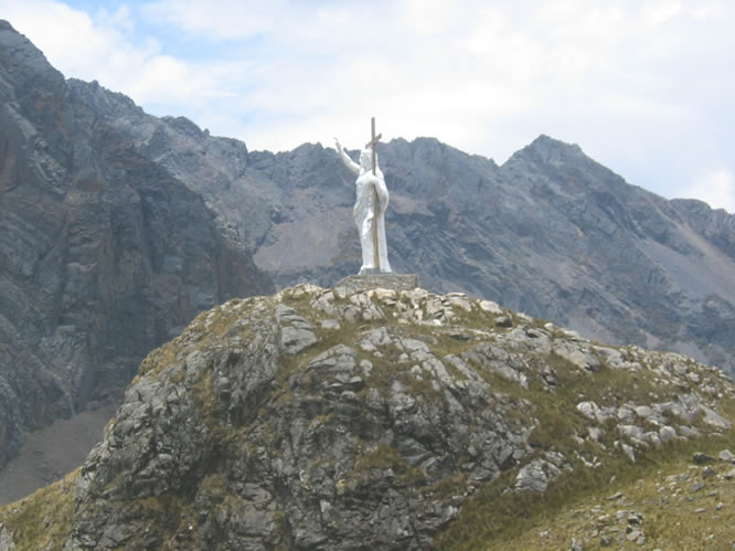 October 20th - 21st cont'd 2003 Having wandered around in the park for a while we headed back to the Panamerican to take the road from Catac across the Cordillera to Chavín and the ruins there. It was going to be a complicated journey. There was only one route we could take and the park guard informed us that the tunnel along the road was currently undergoing work and was only open from 12:00 - 13:00 for vehicles heading to Chavín and only after 6:30 in the evening for vehicles heading from Chavín to Catac. We decided to take our chances for the route back - presumably we would be able to travel back early in the morning before the workmen started work again. The road was paved all the way from Catac and gradually climbed ever steeper, passing the Lago Quericocha and affording great views of the surrounding peaks. The Cauish tunnel, cut through a rock face, is reached at a height of 4,550m. And sure enough, when we reached it, it was indeed closed. A sign indicated that it would open at 11:55am and would remain open until 12:25pm. We arrived at 11:30 and waited in line behind a few vehicles already queuing. Unusually for South America, dead on 11:55, the sign was moved and the tunnel opened. As usual in South America everyone at the back of the queue tried to rush through before everyone at the front. The tunnel was single track and in a terrible state of repair - all through the tunnel were massive flooded potholes. As you emerge into daylight on the other side of the mountains you are met by a giant statue of Christ. We had thought from what the guard had said that only the tunnel was being worked on. Unfortunately this was not the case and the remainder of the journey to Chavín was spent driving through roadworks, extreme dustclouds, stops and starts as work vehicles were turning, and a very narrow, potholed road. Some holes big enough to lose a landy in. It was basically a long building site with big drops over the edge. Added to this were the maniac tour buses from Huaraz who were overtaking everywhere and anywhere to get their cargo of tourists to the ruins. There were a few pale and worried faces peering out of the dust encrusted windows. The pictures don't really do it justice as the valley gets a lot steeper and narrower the further down you get until the single track road is just hanging on the edge of the cliff. Not the type of road we wanted to drive back on in the dark. Click here for the Road Gallery We reached Chavín at about 2pm and found a hotel straight away with parking on the main plaza. (We had intended on camping at the archeological site, as per the guidebook, but when we drove past it didn't look so easy with the landy). Then after a spot of lunch we walked to the archeological site, Chavín de Huantar, to look around. The site, now a World Heritage Trust Site, is a fortress temple, believed to date back to 800 BC. After all the Moche pyramids and tombs we had seen around Trujillo, it was interesting to see the architecture of another culture, which was very different. It was built by the Chavín culture, the oldest major culture in Peru. Above ground is the Castillo and a huge central square, just below ground level, all fairly intact considering its age. But most of the site is underground and you can explore the labyrinth-like underground tunnels with their intricate system of ventilation channels. At the centre of the main underground chamber, where four passageways intersect, is the four metre high, dagger-like carved rock, the Lanzón de Chavín. The entire complex was believed to have been built around this rock. Also interesting were the carved stone heads, only one of which now remains in its original position on the wall of the Castillo. | |||||||||||